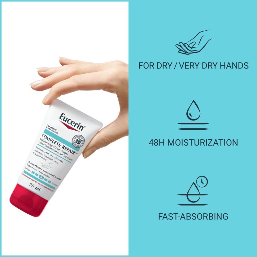 Hands are exposed to cold weather, water, soaps and other chemicals much more frequently than the rest of the body. This makes their skin more vulnerable to a breakdown in barrier function, resulting in moisture loss and dryness, redness due to dryness, scaling, and itching. Eucerin Repair Hand Creme 5% Urea is enriched with Urea and Lactate to soothe dry hand skin by providing the effective moisture it requires.