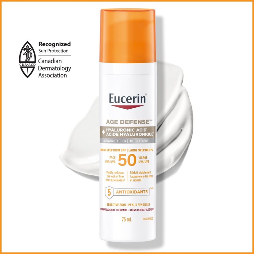 Eucerin Age Defense SPF 50 Face Sunscreen Lotion is formulated with hyaluronic acid to visibly reduce the look of fine lines and wrinkles.* This daily face sunscreen features UVA/UVB sun protection plus a unique Antioxidant Complex, 5 Antioxidants Shield™, that defends the skin against environmental aggressors that weaken the skin’s moisture barrier for healthier looking skin. Eucerin is a skincare brand developed with dermatologists that is based on an uncompromising approach to science. *With continuous use after 1 week.